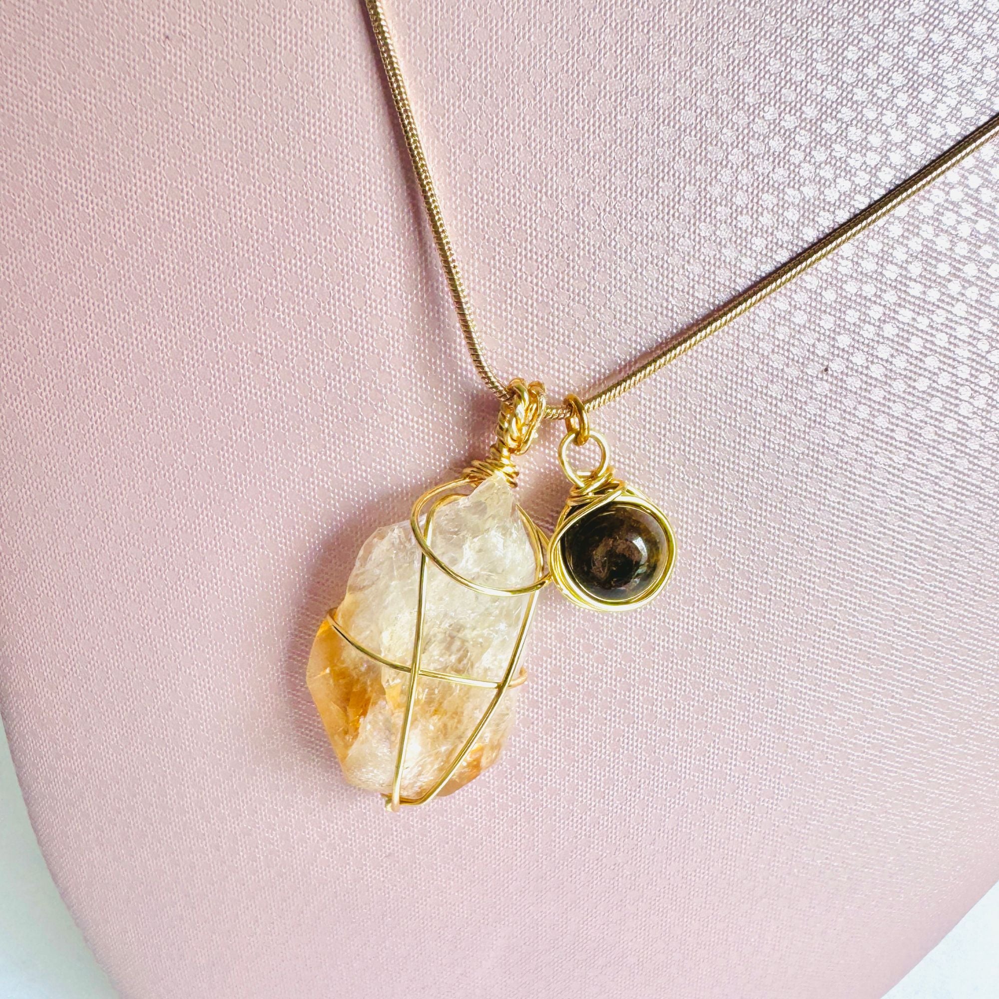 Material: Mineral de cuarzo citrino color miel, piedra esférica ojo de tigre, cadena doble enchapado en oro rose de 18K.