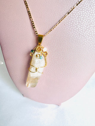 Material: Mineral de cuarzo citrino color miel, cadena doble enchapado en oro rose de 18K.