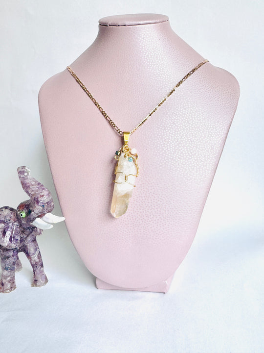 Material: Mineral de cuarzo citrino color miel, cadena doble enchapado en oro rose de 18K. Medida: Cadena de 45cm, cuarzo 4.5cm.Precio regular S/. 79.00